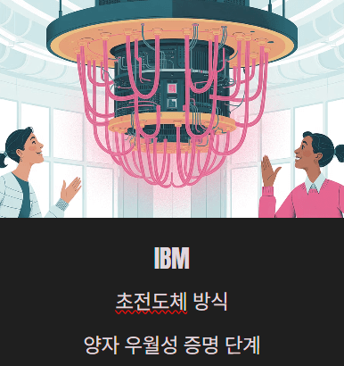 | 초전도체 방식 | 초전도체 사이에 얇은 절연층을 놓고 전압/자기장으로 큐비트 조작 | 연산속도 빠름, 연구 성과 많음 | 큐비트 불안정, 외부 간섭에 취약 | 구글, IBM |