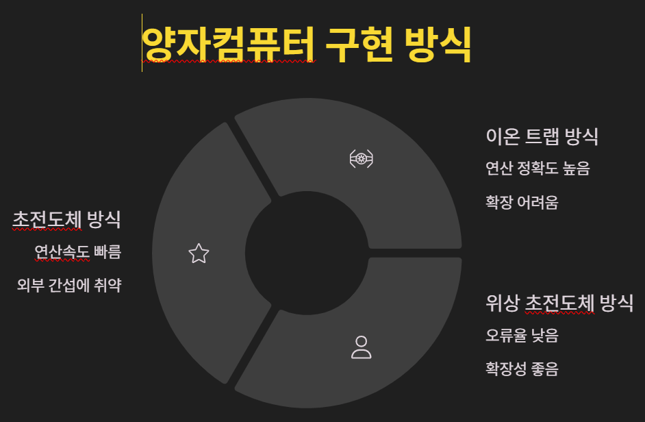 양자컴퓨터를 물리적으로 구현하기 위한 방식은 크게 세 가지가 있으며, 각각 고유한 장단점을 가지고 있습니다.